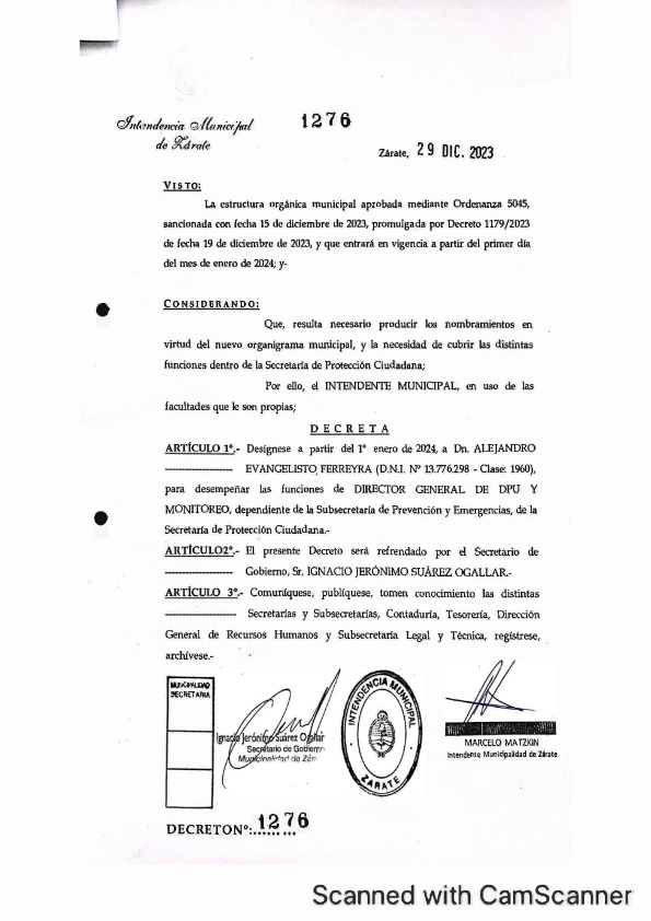Invitamos al señor Secretario que tome conocimiento del Decreto 1279, del 29 de diciembre pasado en donde el Intendente y su Secretario de Gobierno designan ‘a partir del 1° enero de 2024, a Dn. ALEJANDRO EVANGELISTO FERREYRA (D.N.I. N° 13.776.298 – Clase: 1960), para desempeñar las funciones de DIRECTOR GENERAL DE DPU Y MONITOREO, dependiente de la Subsecretaría de Prevención y Emergencias, de la Secretaría de Protección Ciudadana.’