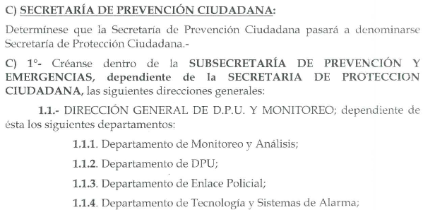 Además de cambiar el nombre de la Secretaría de Seguridad, que menos de un mes atrás el Departamento Ejecutivo había denominado Secretaría de Prevención Ciudadana y que ahora mutó en Secretaría de Protección Ciudadana, el nuevo organigrama plantea que en su interior habrá una ‘DIRECCION GENERAL DE D.P.U. Y MONITOREO’. ¿Esto no lo sabía Iglesias? ¿Matzkin y Suárez Ogallar decidieron la creación de la Dirección General sin su consentimiento? Raro. Como raro es que Iglesias también desconozca que al interior de esta Dirección General hay un Departamento de DPU.