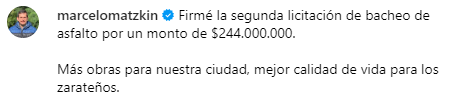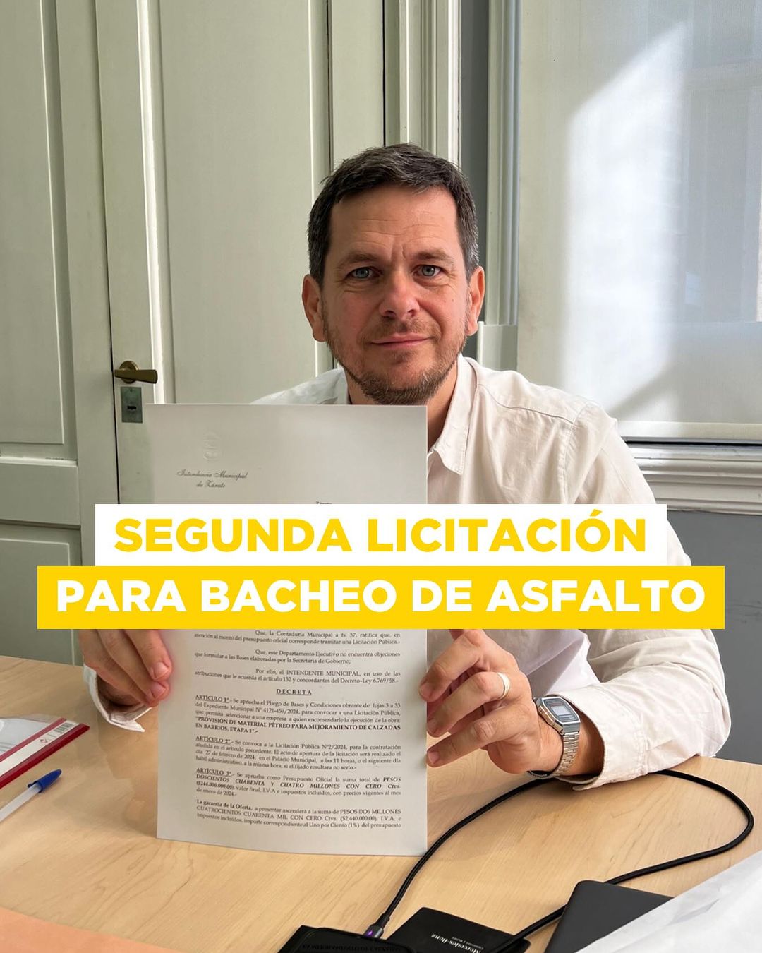 Días atrás publicó en sus redes sociales que había firmado ‘la segunda licitación de bacheo de asfalto por un monto de $244.000.000.’ y eso es mentira.