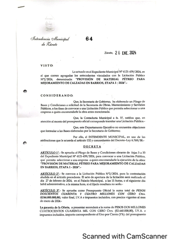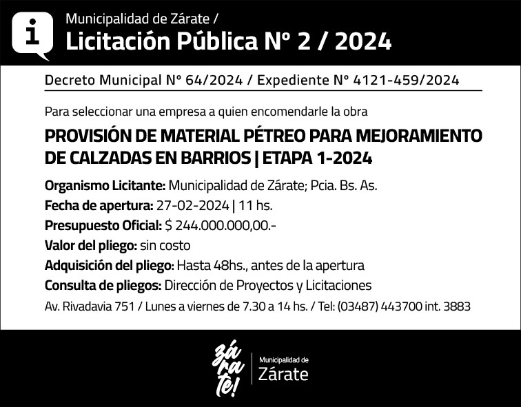 Además en el pliego se menciona que ‘El proveedor deberá proceder a la entrega del material, en la sede de la Secretaría de Obras, Mantenimiento y Servicios Públicos de la Municipalidad de Zárate (Corralón Municipal), sito en Avda. Mitre 2021, esquina calle Córdoba y/o puesto en obra, en los horarios establecidos, siempre ubicados en el ámbito territorial del Partido de Zárate y que, les será notificado de manera fehaciente.’, aunque no se menciona dónde se encuentran las obras ni cuántas son. Resulta rara la forma de licitar, puesto que ni siquiera se sabe dónde entregar, y claramente no es lo mismo entregar en el Corralón Municipal que en la Isla Botija, aunque ambos lugares están en el partido de Zárate.