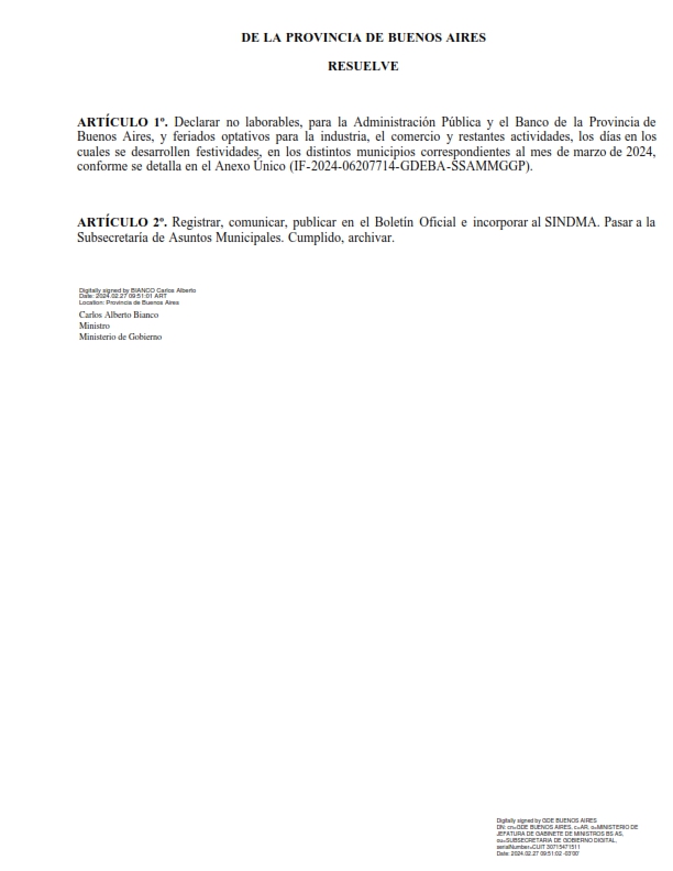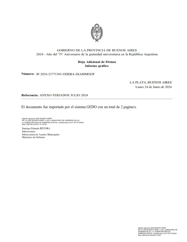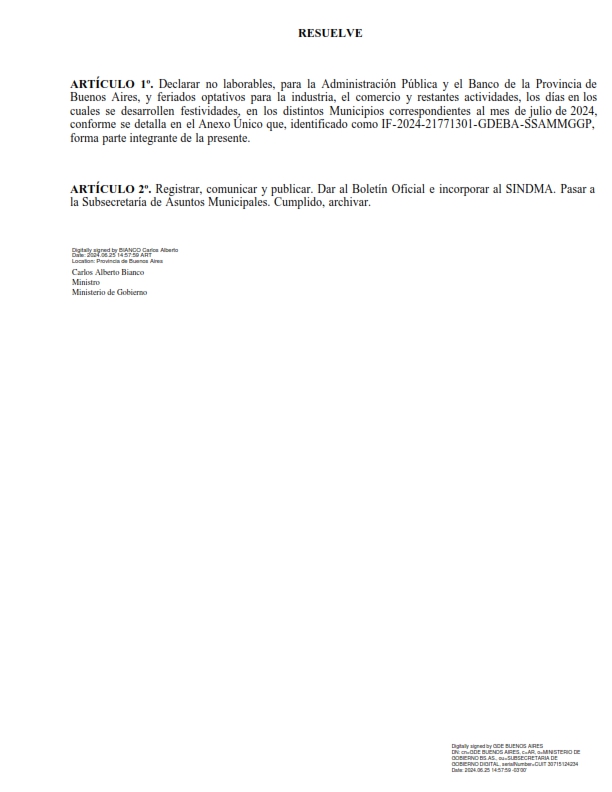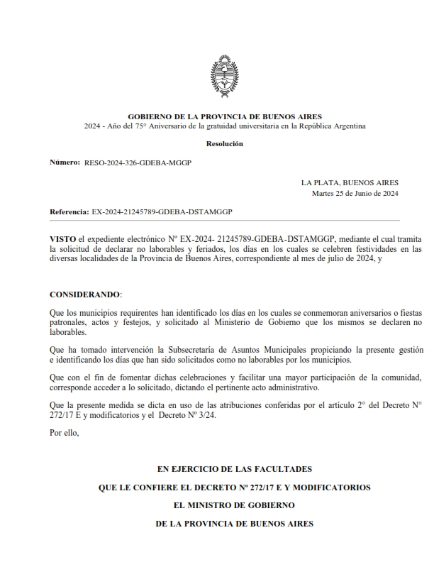 ¿Qué ocurrió en esta oportunidad para Julio? La Provincia de Buenos Aires dictó la RESO-2024-326-GDEBA-MGGP donde se fijan los asuetos y días no laborables para el mes en curso, y allí nada se dice de un asueto en Zárate.