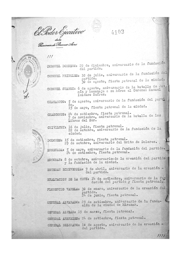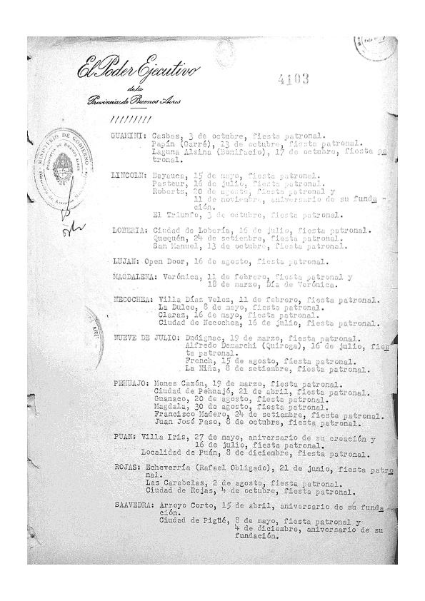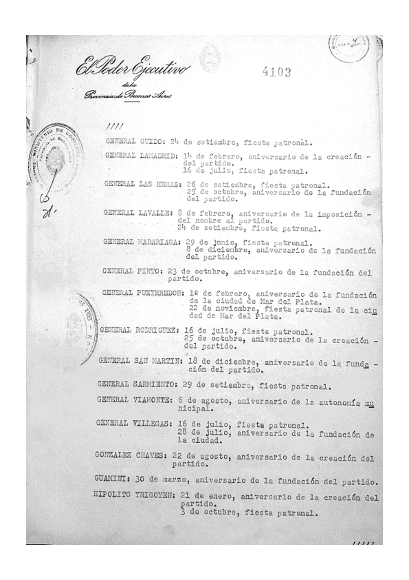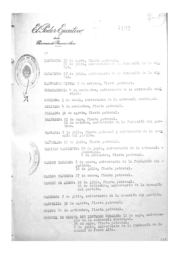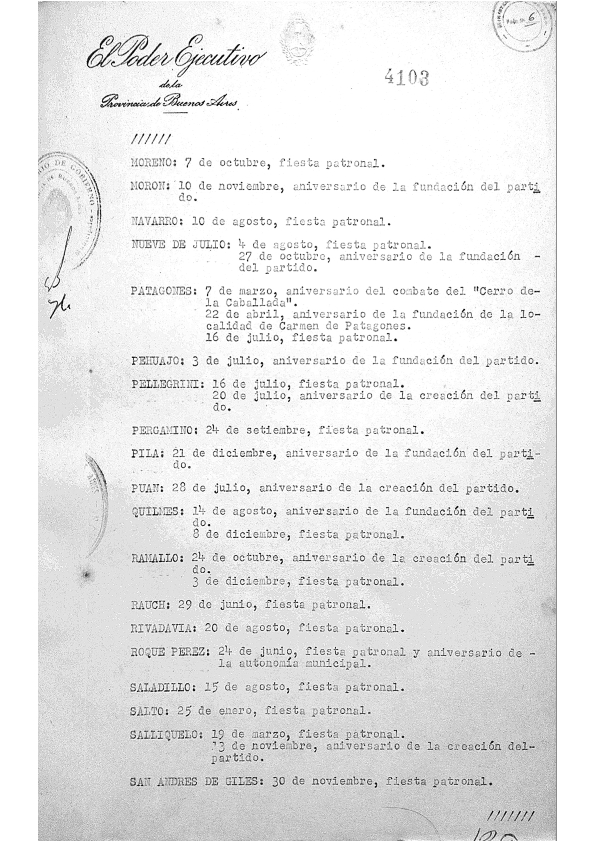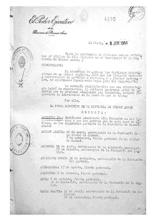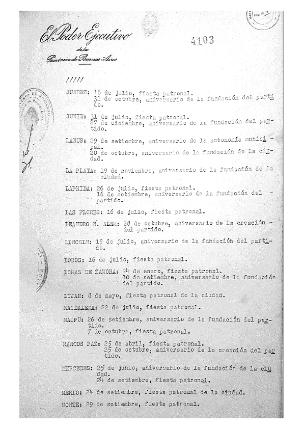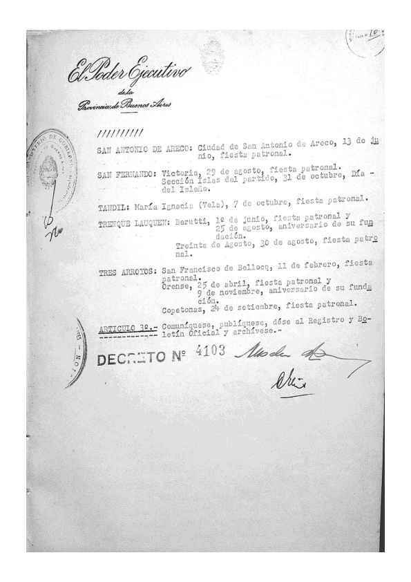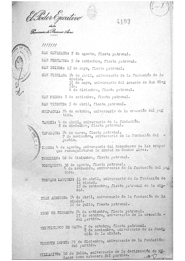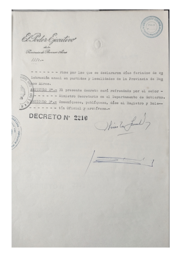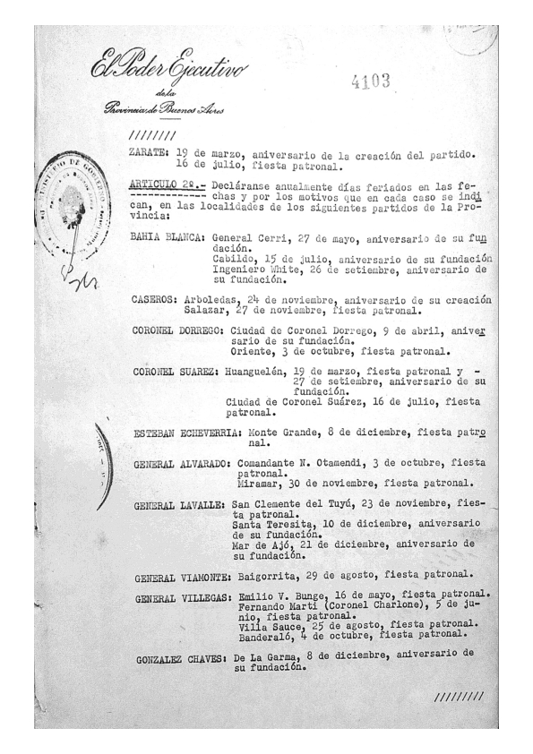 Uno de los primeros antecedentes es el Decreto 4103/1964 de 8 de junio de aquel año por el que el entonces gobernador bonaerense Anselmo Marini declaraba ‘anualmente días feriados en las fechas por los motivos que en cada caso se indican, en los siguientes partidos de la Provincia de Buenos Aires’, y en el caso de nuestro Distrito se especificaba ‘ZARATE; 19 de marzo, aniversario de la creación del partido. 16 de julio, fiesta patronal.’