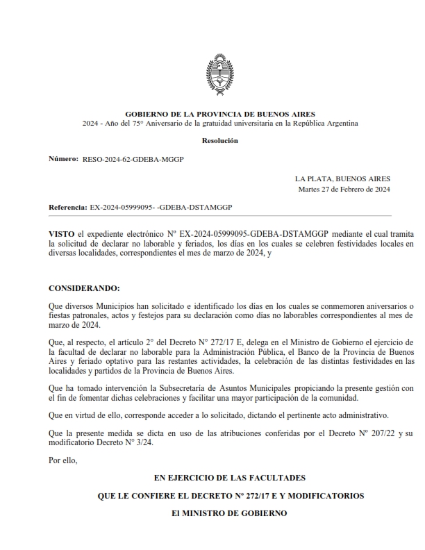 Por ello es que el gobierno provincial dictó la Resolución RESO-2024-62-GDEBA-MGGP que fijaba los asuetos de marzo e incluyó el 18 de marzo como aniversario fundacional… y nadie alzó la mano para explicar que el 18 de marzo no se creó Zárate, amén que los Partidos se crean, no se fundan.