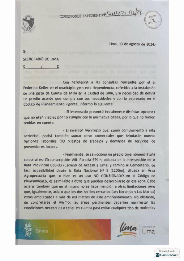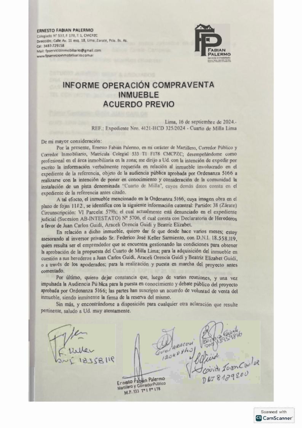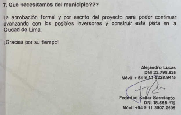 Pero más curioso es que la Ordenanza de llamado a la Audiencia Pública se sancionó el 5 de septiembre, y se mencionaba que existía ya un pre acuerdo para la compra del terreno, y con la publicación del Expediente nos enteramos que el pre acuerdo solo se efectuó 11 días después de la sanción de la Ordenanza. De hecho el martillero involucrado, Fabián Palermo lo expone en un escrito donde afirma ‘quiero dar fe que desde hace varios meses; estoy asesorando al inversor privado Sr. Federico José Keller Sarmiento, con D.N.I. 18.558.119, quien resulta ser el emprendedor que se encuentra gestionando las condiciones para obtener la aprobación de la propuesta del Cuarto de Milla Lima; para la adquisición del inmueble en cuestión a sus herederos Juan Carlos Guidi, Araceli Orencia Guidi y Beatriz Elizabet Guidi o a través de los apoderados; para la realización y puesta en marcha del proyecto antes comentado.