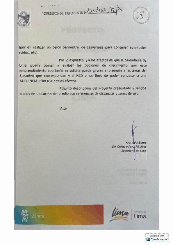 Rojas generó esta nota motivado por la misiva enviada por la Directora de Obras y Servicios Públicos de la Secretaría de Lima, María Inés Zonta, quien al final de su texto menciona que ‘a los efectos de que la ciudadanía de Lima pueda opinar y evaluar las opciones de crecimiento que este emprendimiento aportaría, se solicita pueda girarse el presente a las áreas del Ejecutivo que correspondan y al HCD a los fines de poder convocar a una AUDIENCIA PÚBLICA a tales efectos.’