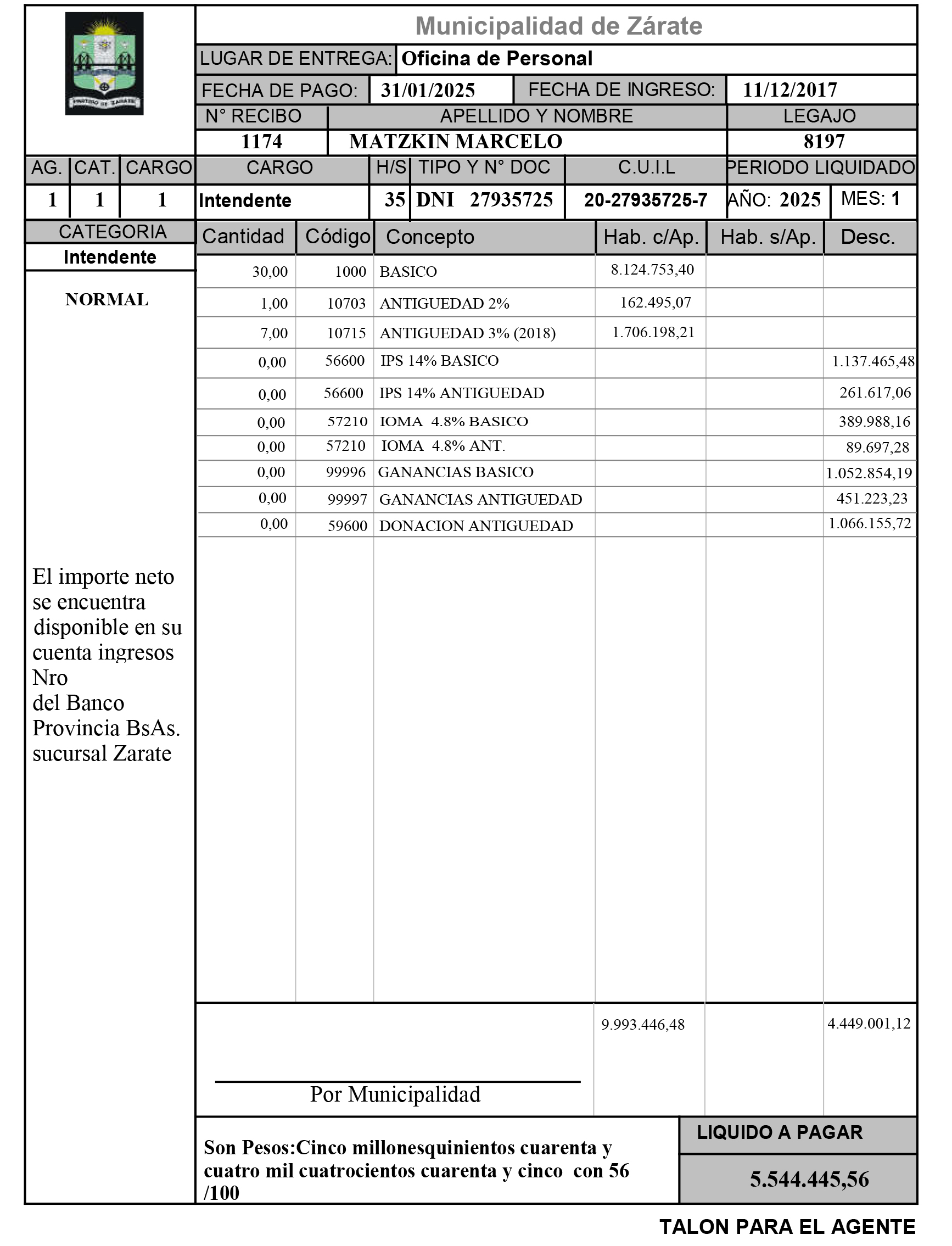 Un dato no menor es la fecha de firma y publicación del decreto. Para ese momento, los haberes de enero ya habían sido abonados, tal como lo refleja el recibo de sueldo del Intendente Municipal. Esto abre interrogantes clave: