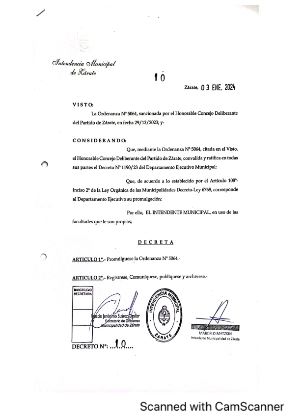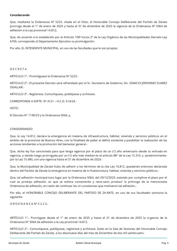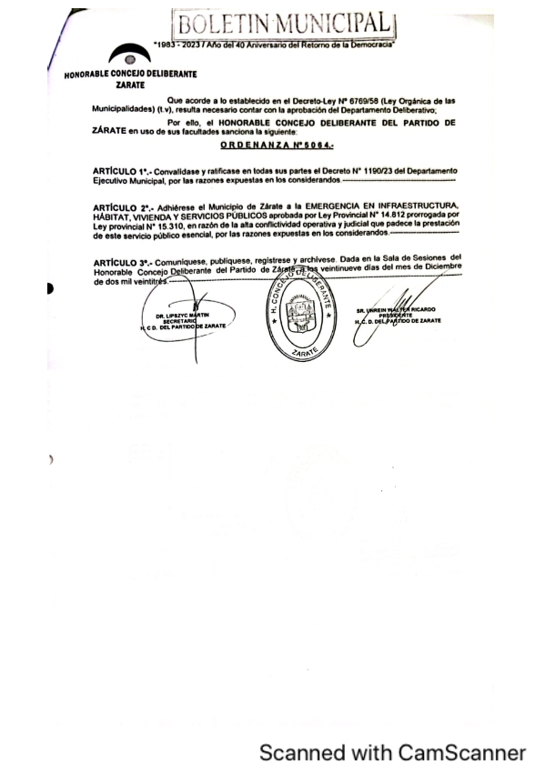 La emergencia en las órbitas de servicios públicos, infraestructura y vivienda ya estaba dictada por la Ordenanza 5064, que convalidó y ratificó ‘en todas sus partes el Decreto N° 1190/23 del Departamento Ejecutivo Municipal, por las razones expuestas en los considerandos’ y adhirió al ‘Municipio de Zárate a la EMERGENCIA EN INFRAESTRUCTURRA, HABITAT, VIVIENDA Y SERVICIOS PUBLICOS aprobada por Ley Provincial N° 14812 prorrogada por Ley provincial N° 15310, en razón de la alta conflictividad operativa y judicial que padece la prestación de este servicio público esencial, por las razones expuestas en los considerandos.’