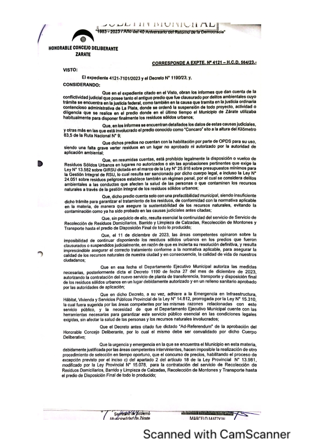 ¿Qué decía el Decreto 1190/23? El que proponía adherir al ‘Municipio de Zárate a la EMERGENCIA EN INFRAESTRUCTURRA, HABITAT, VIVIENDA Y SERVICIOS PUBLICOS aprobada por Ley Provincial N° 14812 prorrogada por Ley provincial N° 15310, en razón de la alta conflictividad operativa y judicial que padece la prestación de este servicio público esencial, por las razones expuestas en los considerandos.’… pero no solo eso, es el mismo Decreto que autorizó ‘el CONCURSO DE PRECIOS para la contratación directa de la mejor oferta de una planta de transferencia, transporte y disposición final de Residuos Sólidos Urbanos, comprendiendo a los Residuos Domiciliarios, Barrido y Limpieza de Calzadas, Recolección de Montones y Transporte; por encontrarse acreditadas razones de URGENCIA o EMERGENCIA que impiden la realización de otro procedimiento de selección en el tiempo oportuno,’
