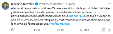 Y ahí llegó el posteo. Medido. Pulcro. Tan calculado que olía a Community Manager más que a funcionario. Dijo: ‘Atento al temporal ocurrido en Zárate y en virtud de la proximidad del viaje y de la necesidad de estar presente acá, he decidido cancelar mi participación en la Conferencia Anual de la @iaeaorg.’