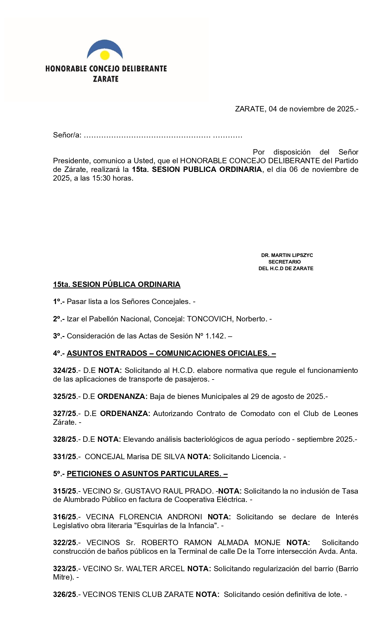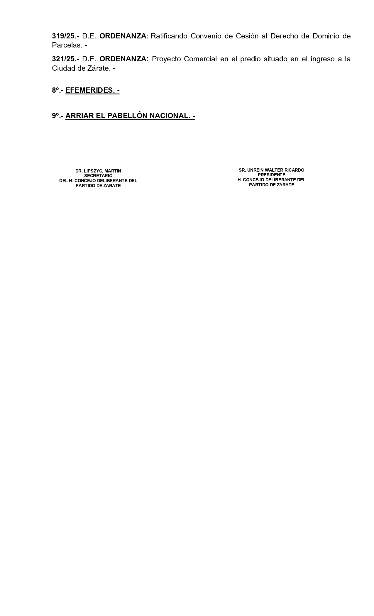 Lo mismo ocurre con el proyecto siguiente: ‘293/25.- D.E. ORDENANZA: Establécese la prohibición de estacionar, durante las 24 horas, en la calle LINTRIDIS de la ciudad de Zárate, desde la Avenida Antártida Argentina hasta la calle España.’