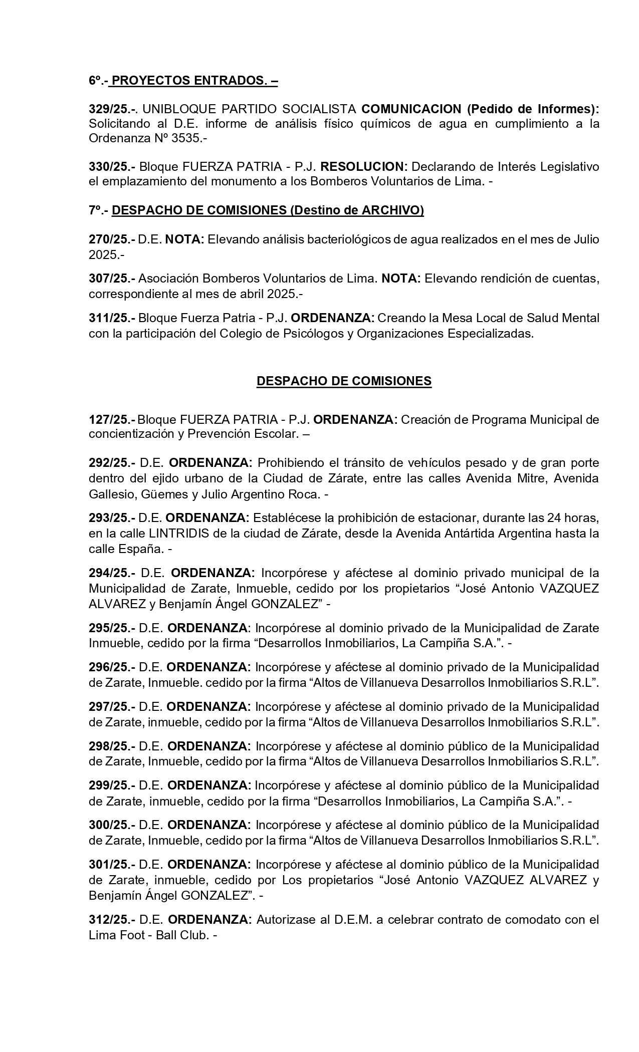 Veamos el primer expediente: ‘292/25.- D.E. ORDENANZA: Prohibiendo el tránsito de vehículos pesado y de gran porte dentro del ejido urbano de la Ciudad de Zárate, entre las calles Avenida Mitre, Avenida Gallesio, Güemes y Julio Argentino Roca.’ (sic)