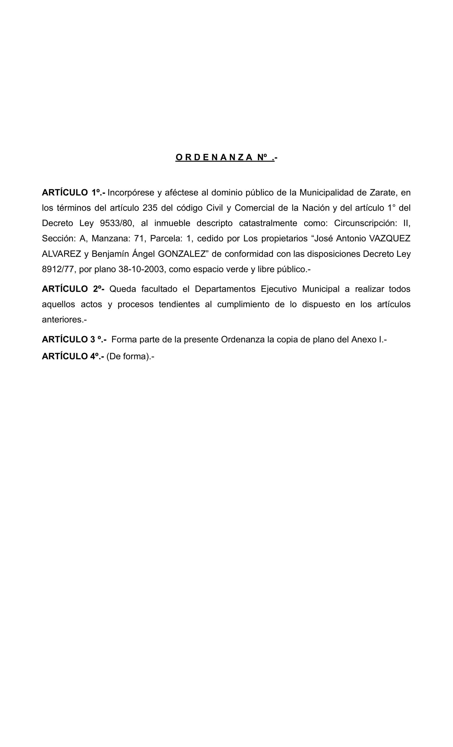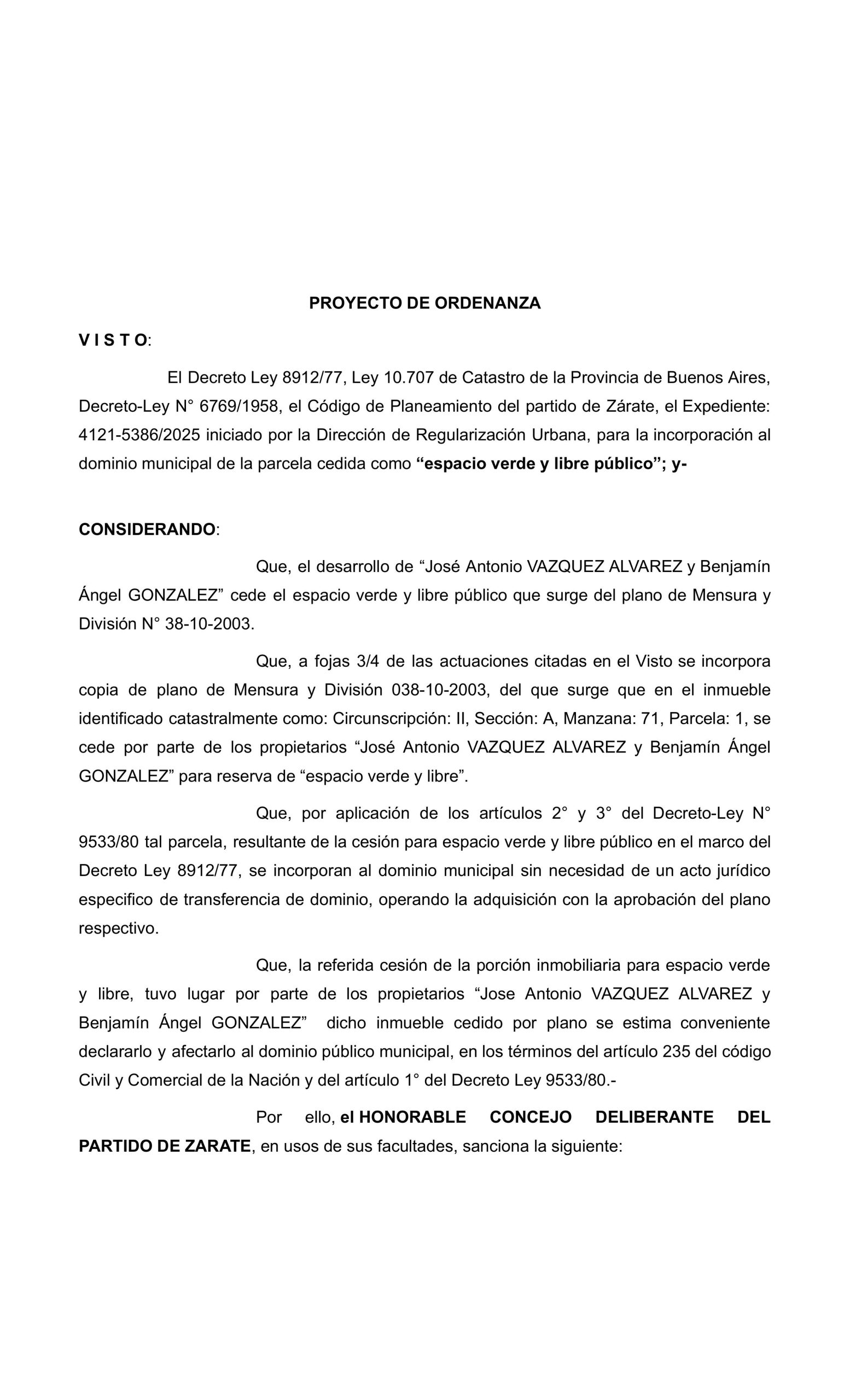 Pero es por demás curioso. Tomemos como ejemplo el ‘Expediente 301/25.- D.E. ORDENANZA: Incorpórese y aféctese al dominio público de la Municipalidad de Zárate, inmueble, cedido por Los propietarios ‘José Antonio VAZQUEZ ALVAREZ y Benjamín Ángel GONZALEZ’.