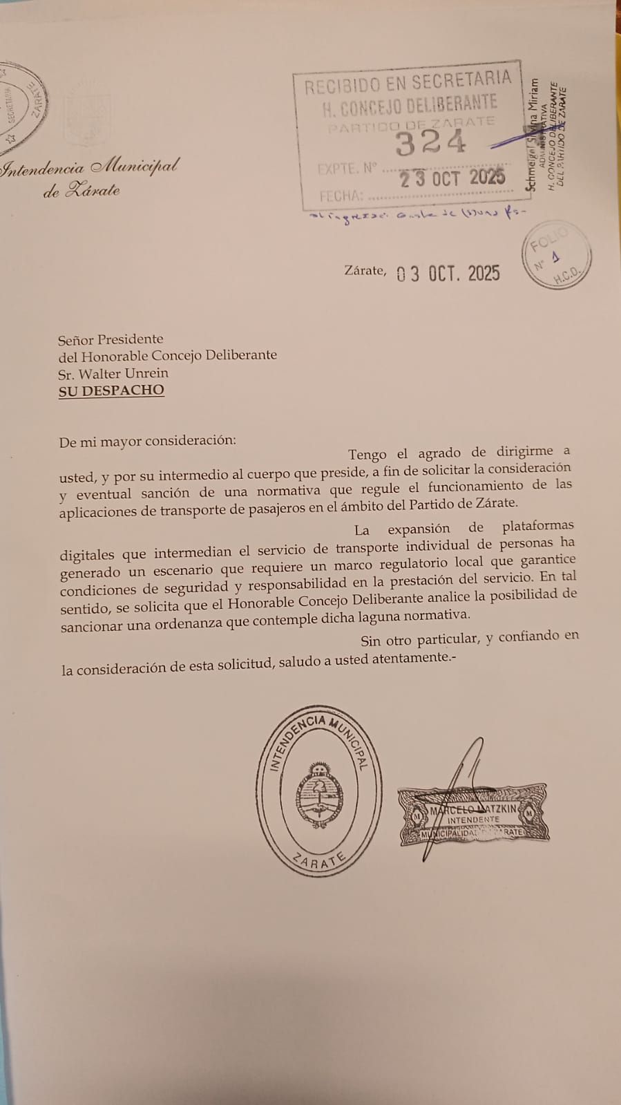 En un curioso texto el Ejecutivo local le solicita al Deliberativo ‘analice la posibilidad de sancionar una ordenanza que contemple’ la ‘laguna normativa’ existente, a juicio del Intendente, a partir de ‘la expansión de plataformas digitales que intermedian el servicio de transporte individual de personas’.