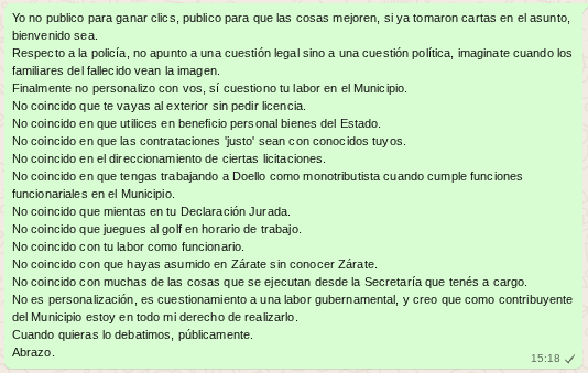 Apuntalados en lo que pensamos, compartimos con los lectores el mensaje que le enviamos, y que no leyó porque nos bloqueó (¿haciéndole caso al Intendente formal que pidió que los funcionarios no tuvieran contacto con un servidor?), aunque seguramente lo lea aquí (un lugar que Matzkin no controla), para que quede claro nuestro proceder: